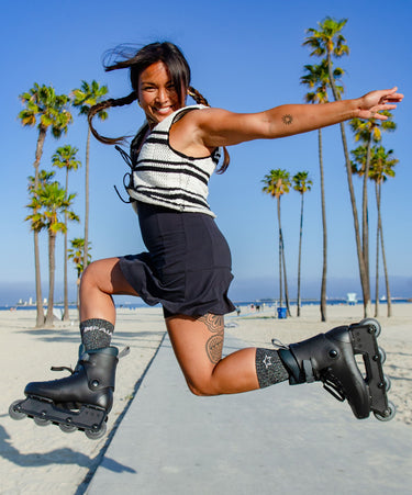 Impala is for everyone – whether you’re into roller skating, inline skating, or skateboarding, it’s all about having fun! With a nostalgic throwback to the 70’s, 80’s and 90’s, Impala is bringing back the yesteryears of skate. Impala is driven by a team of girls with a passion for skating and it's our mission to help support a positive and encouraging community for skaters of all levels. Our range of recreational roller skates are made for fun! Featuring aluminum baseplate, colorful bushings and PU stoppers, soft urethane wheels, Impala’s pink ABEC 7 bearings, padded collar for comfort and metal speed lace eyelets. We also have a wide range of vegan friendly skates! Our roller skates are available in a range of multiple colors and prints, from our best-selling Black Holographic Roller Skates to our latest printed addition, the Tropicana. A few of your favorite Impala Roller Skates are even available in an extended US women's size 1-14 range – including Barbie Pink, Black, Camo, Marawa Gold, Tropicana, and Black Holographic. Stay safe with protective pads that match your favorite Impala Skates! We’ve also created custom-designed velcro skate protective gear to match your skates in Sky Blue, Pink, Black, Tropicana, Barbie Pink, Barbie Bright Yellow and for our Marawa Gold collaboration plus more! Designed for recreational use in and outdoors, our skates can be worn by everyone – check our size charts to convert for men’s and kid’s sizing. When purchasing your Impala roller skates, we recommend our size chart!